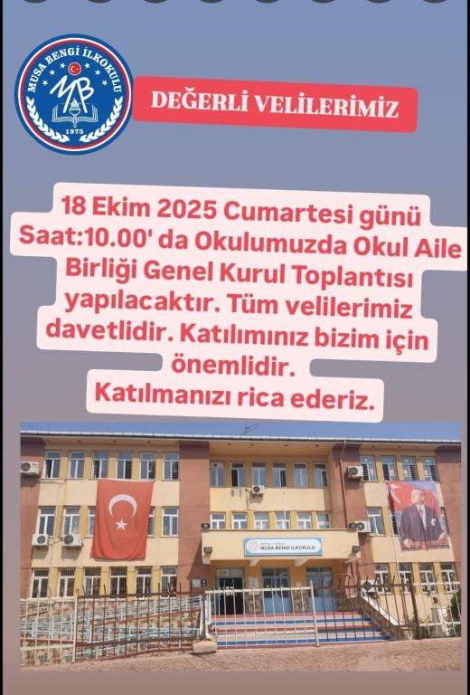 2024-2026 Eğitim Öğretim Yılı Aile Birliği Genel Kurul Toplantısı 18 Ekim 2025 Cumartesi Günü Saat:10:00'da yapılacaktır. Tüm velilerimiz davetlidir.